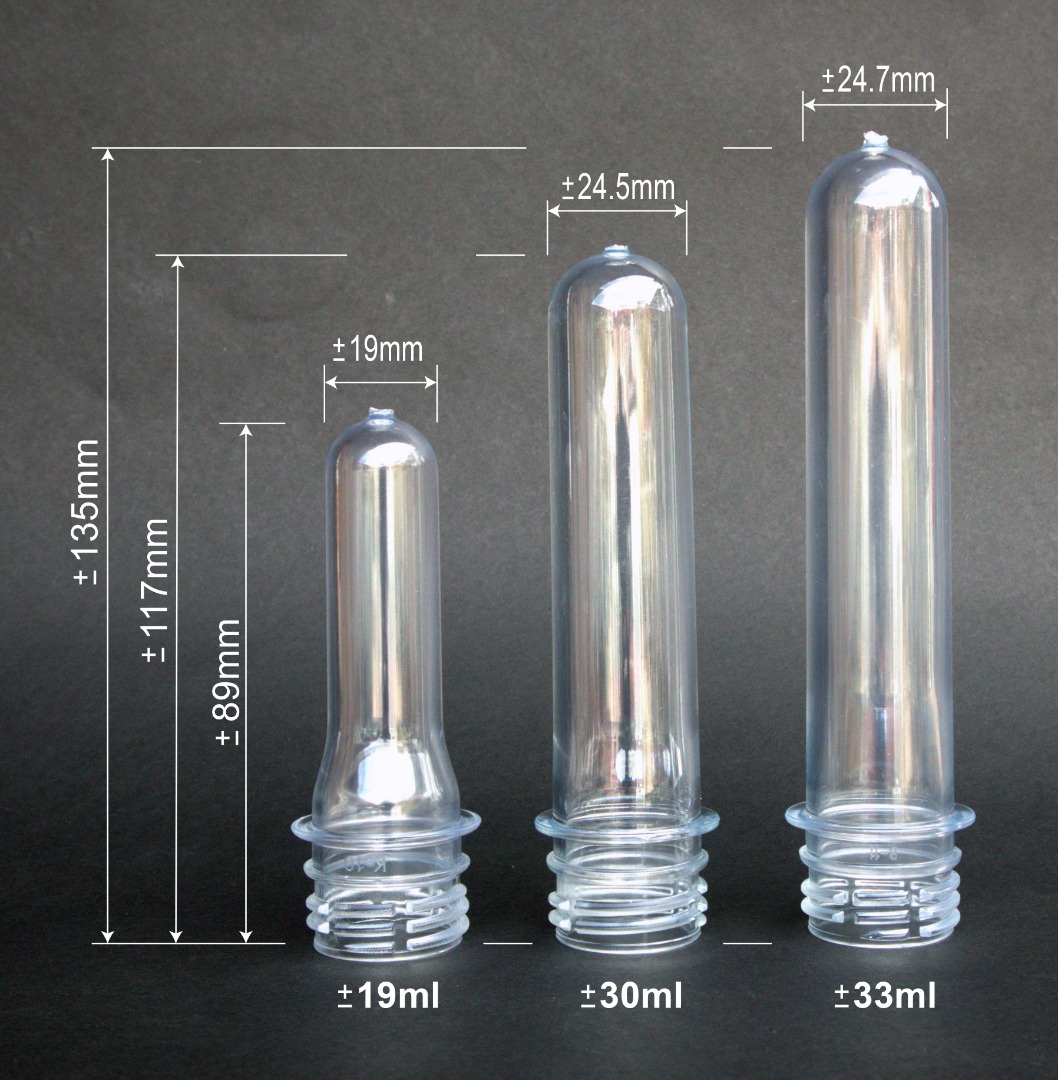 Preform comes in various weights. Depending on the volume of the bottles, the preform weights used differ as well. This is because for higher volume, we will need to use heavier preform to maintain the thickness of the bottle. Otherwise, the bottle will be very thin and crumpled easily. Below is the list of bottles produced with the preforms.